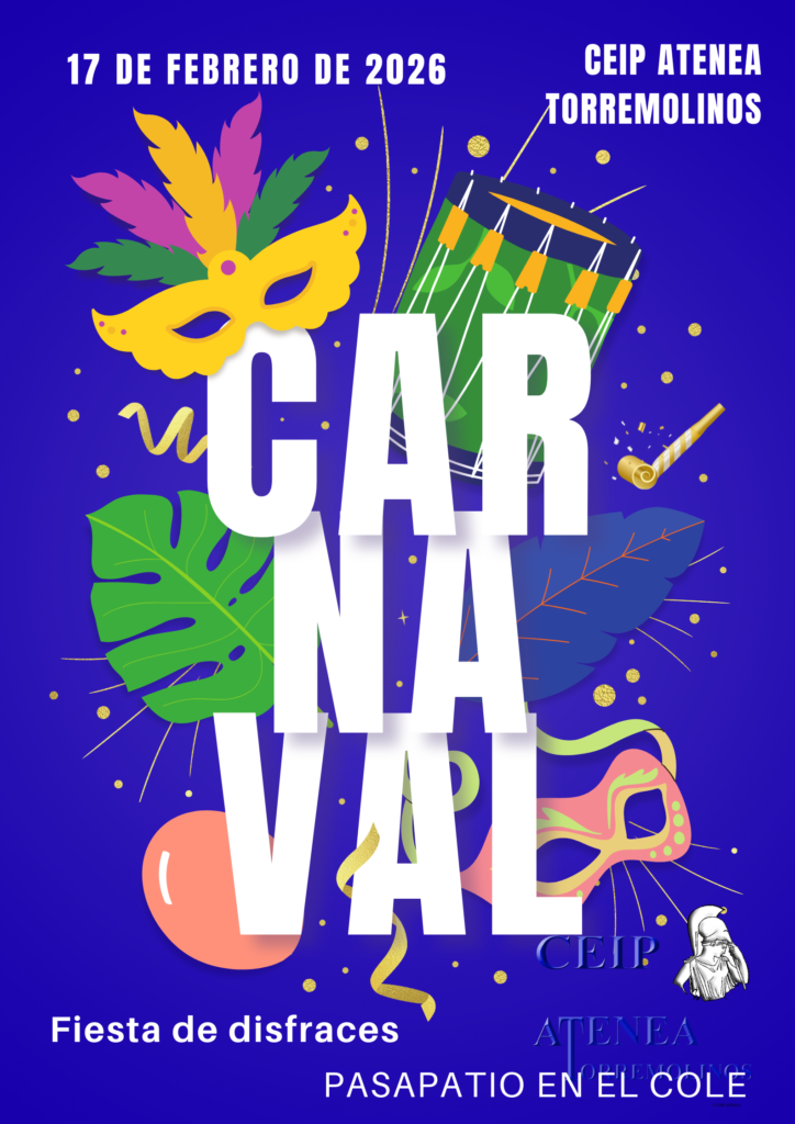 El próximo martes, 17 de febrero de 20026, celebramos en el CEIP Atenea, el Carnaval. Elige tu disfraz favorito y participa en nuestro espectacular «pasapatio».